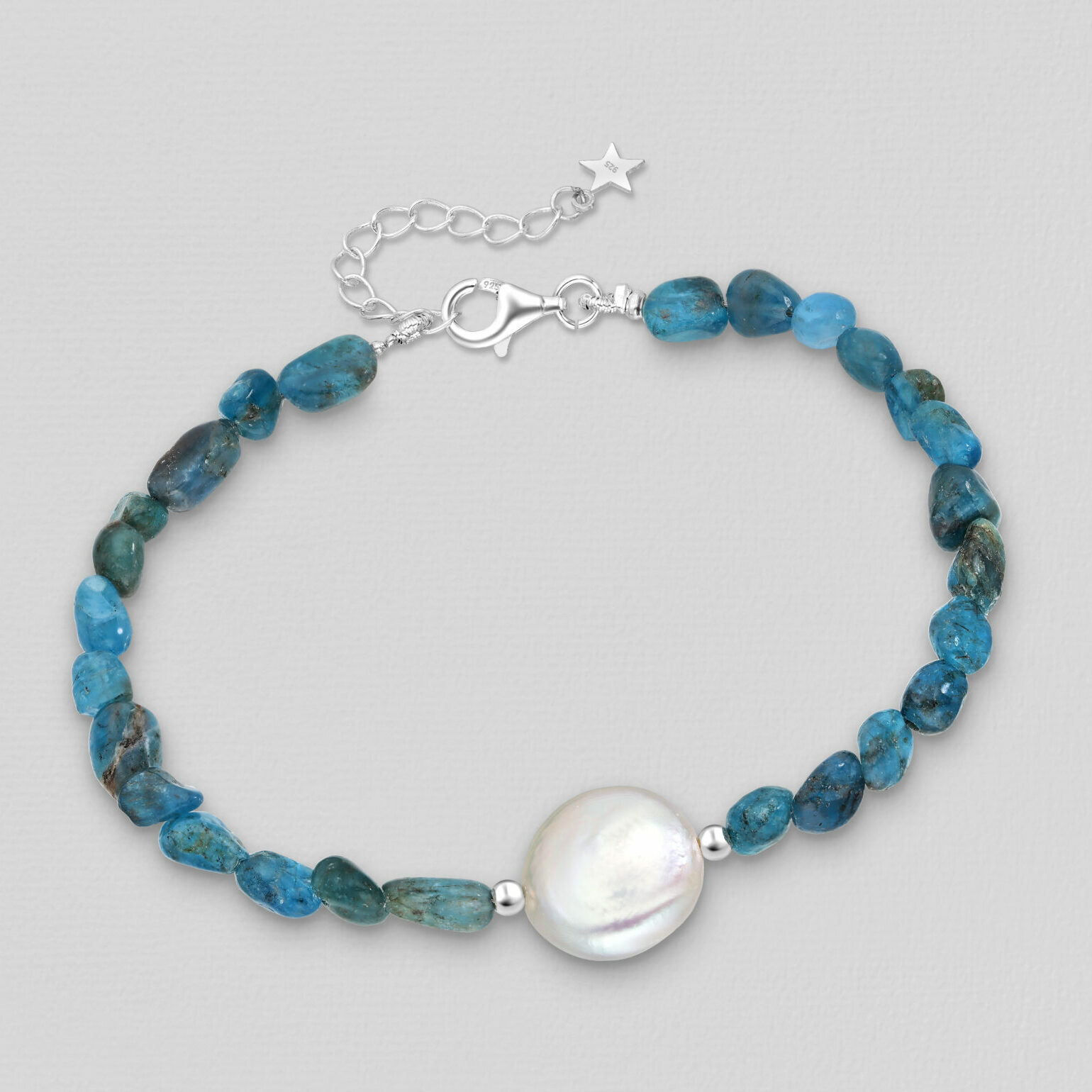 Narukvica srebro, poludragi kamen Apatit i slatkovodni biser