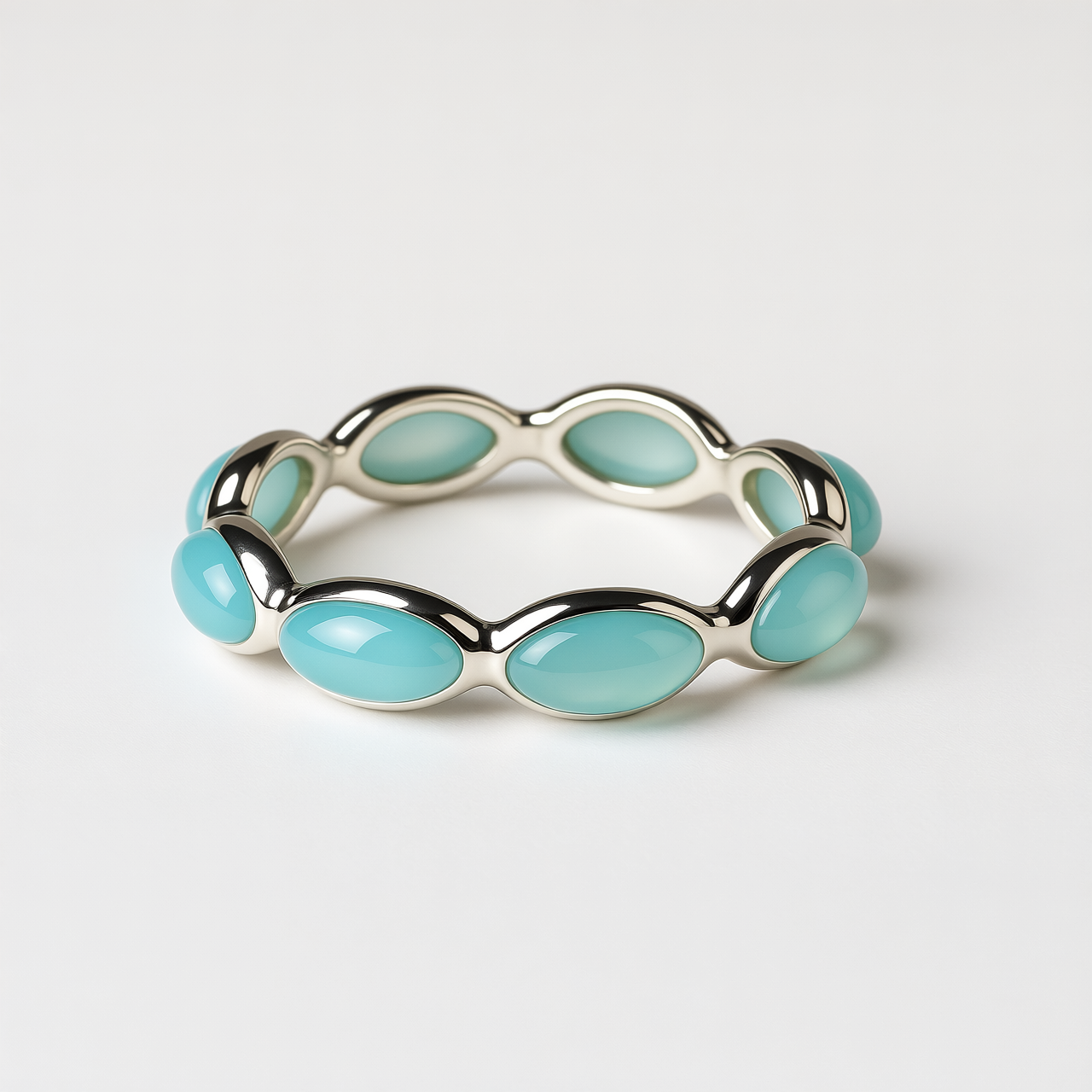 Elegantan srebrni prsten s kontinuiranim nizom ovalno brušenih aqua kalcedona nježne tirkizne boje. Fluidni, valoviti dizajn okvira i glatka završna obrada čine ga udobnim i sofisticiranim komadom za svakodnevnu eleganciju.